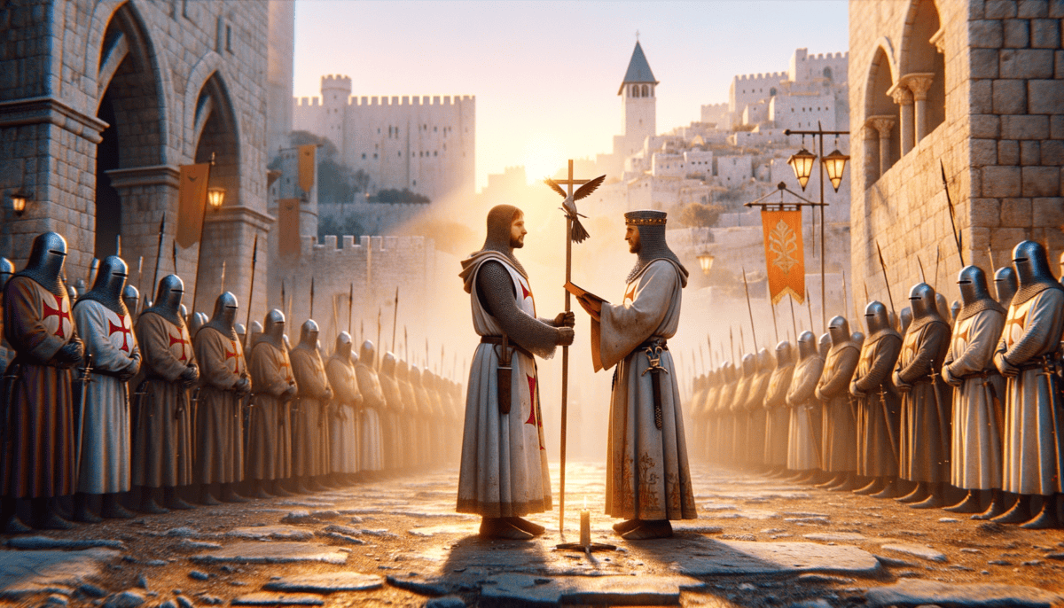 The desert sun blazed hot over Jerusalem as Sir Thomas stood atop the city walls. His white Templar cloak fluttered in the warm breeze. Below, he could see an army approaching. The red banners of Saladin’s forces stretched across the horizon.