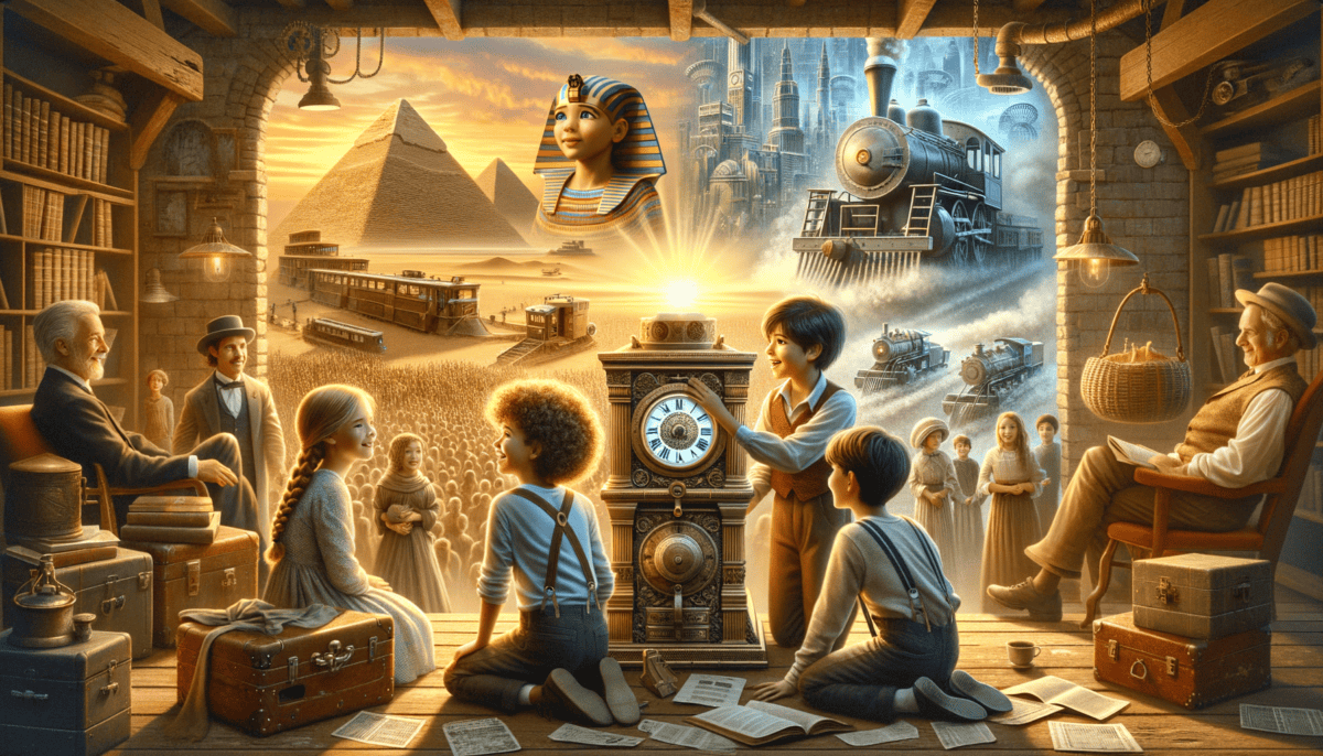 Emma pulled sand from her pocket. Aiden found a medieval coin. Leo had steam engine blueprints. And Zoe wore a futuristic bracelet that glowed softly.